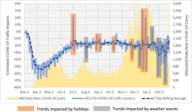MDOT has been closely monitoring traffic patterns throughout the pandemic, and we are continuing to monitor travel changes and projections.  Currently, daily traffic volumes on I-495 and I-270 are down between 10 to 20 percent compared to the same time in 2019/2020 due to closures and policies.