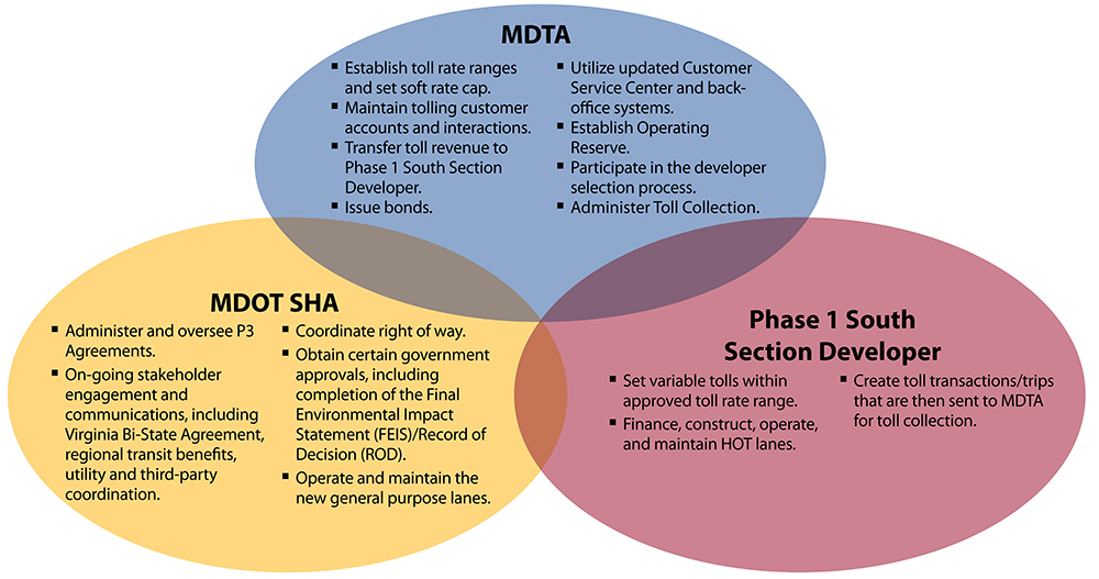 MDOT, including MDOT SHA, and the MDTA will both be party to the P3 Agreements. MDOT SHA is responsible for the overall management of the P3 Program development and delivery. The MDTA is the only State entity with the authority to set, revise and fix tolls for State transportation facilities and is responsible for setting a toll rate range and conducting toll collection operations for Phase 1 South. The toll rate ranges for Phase 1 South: American Legion Bridge I-270 to I-370 will be established by the MDTA only after a period of public comment, review and hearings.
