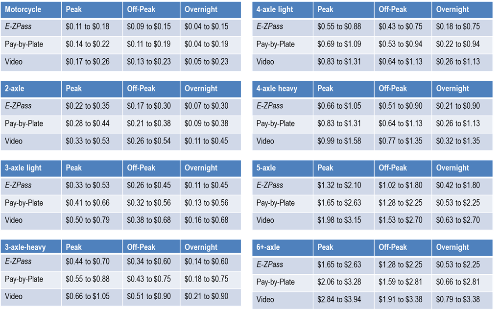 - The minimum trip toll (not per mile) by payment type for all vehicle types would be $0.40 for customers using E-ZPass, $0.50 for customers using Pay-By-Plate (Registered Video), and $1.00 for customers using Video Tolling (Unregistered Video).
