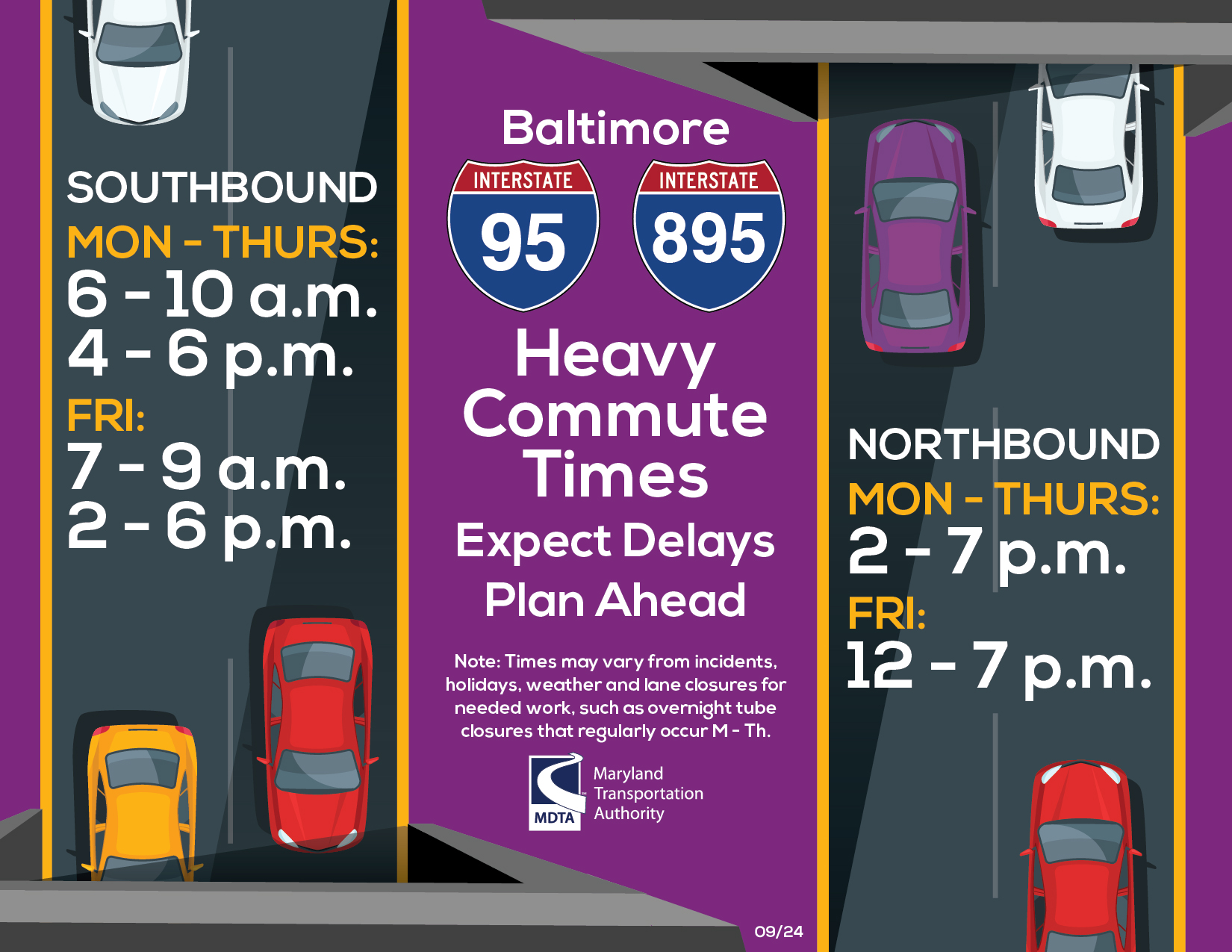 www.mdta.maryland.gov/harborcrossings brings together commuting resources and transportation options to help drivers plan ahead. Since the collapse of the bridge in March, Baltimore-area drivers now experience longer commute times and extended rush-hour periods. The web page includes an infographic showing current heavy commute times when drivers should expect delays for I-95 Fort McHenry Tunnel and I-895 Baltimore Harbor Tunnel. Consider ridesharing or public transportation, and when possible avoid driving during heavy commute times.