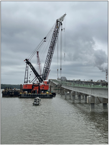 ANNAPOLIS, MD (March 7, 2023) – Work on the first section of the Eastbound Bay Bridge Deck Replacement will get underway this fall, but motorists will soon see a crane alongside the bridge to perform some under-bridge utility work in preparation for the project. A tall crane (see photo) will be in place along the bridge starting in mid-March for work that will occur during routine off-peak lane closures. Additional cranes will be used during the deck replacement and maintenance.