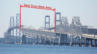 section – known as a deck truss section, see area shown at right – as the first in a series of projects over the next several decades to maintain safe and working order conditions for the 71-year-old span. The timing of future phases and other projects will depend on available funding and bridge conditions.