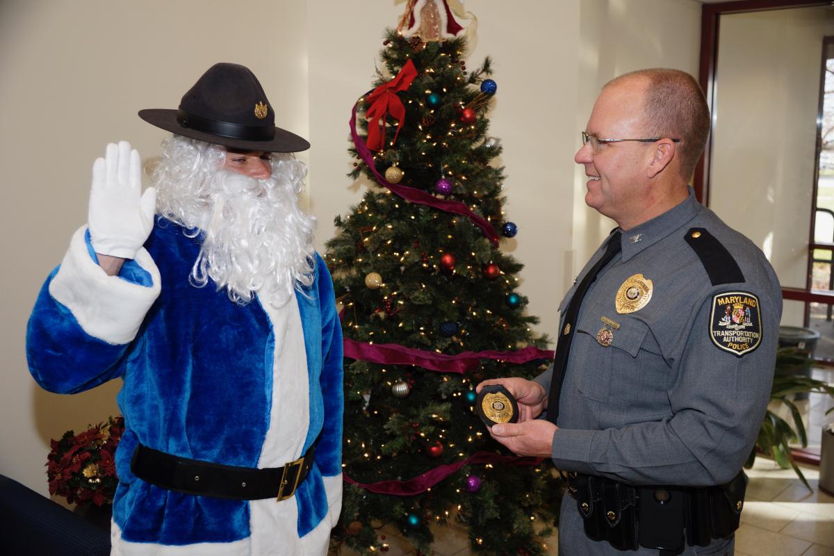 BALTIMORE, MD – Earlier today, Maryland Transportation Authority (MDTA) Police Chief Col. Jerry Jones swore in the agency’s newest officer. Ofc. S. Claus, badge #1225, will be assigned to Toys for Tots collection sites at toll facilities across Maryland and at the Port of Baltimore.