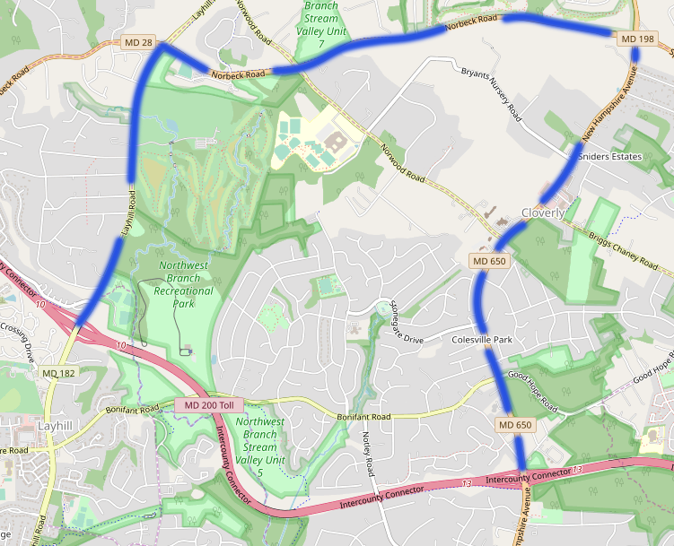 The following weekend, from 9 p.m. Friday, January 31, until 5 a.m. Monday, February 3, eastbound ICC/MD 200 traffic will be detoured at Layhill Road (MD 182). The detour route will direct motorists north on Layhill Road to Norbeck Road, east on Norbeck Road to New Hampshire Avenue (MD 650) and south on New Hampshire Avenue back to eastbound ICC/MD 200.