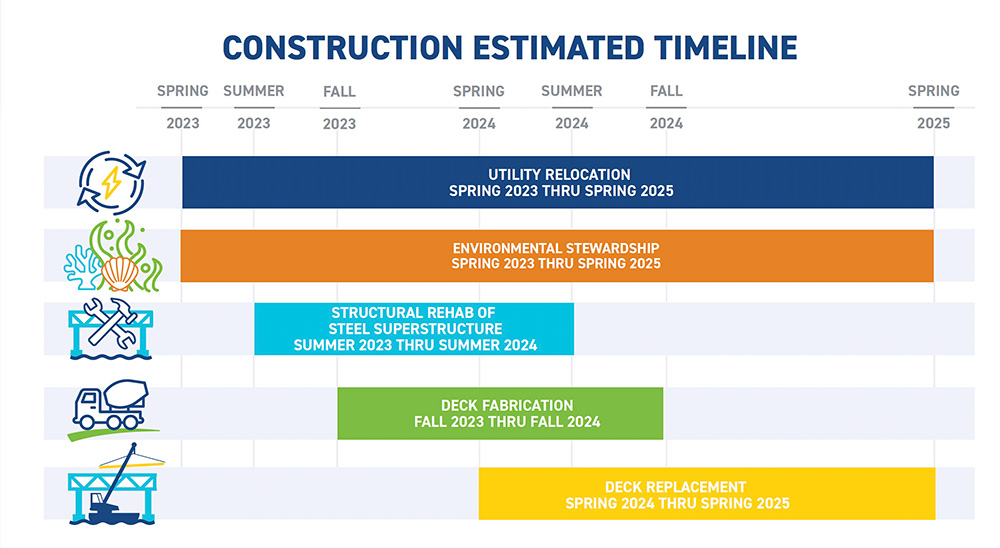 A: The deck panel replacements will begin in winter 2023/2024, with lanes reopening each day in time for morning commuters. The project is expected to be complete by spring 2025. Temporary single-lane daytime closures will be used throughout the project duration. Overnight closures also will be necessary for the other work, such as utility relocations and structural rehabilitation of the steel superstructure.