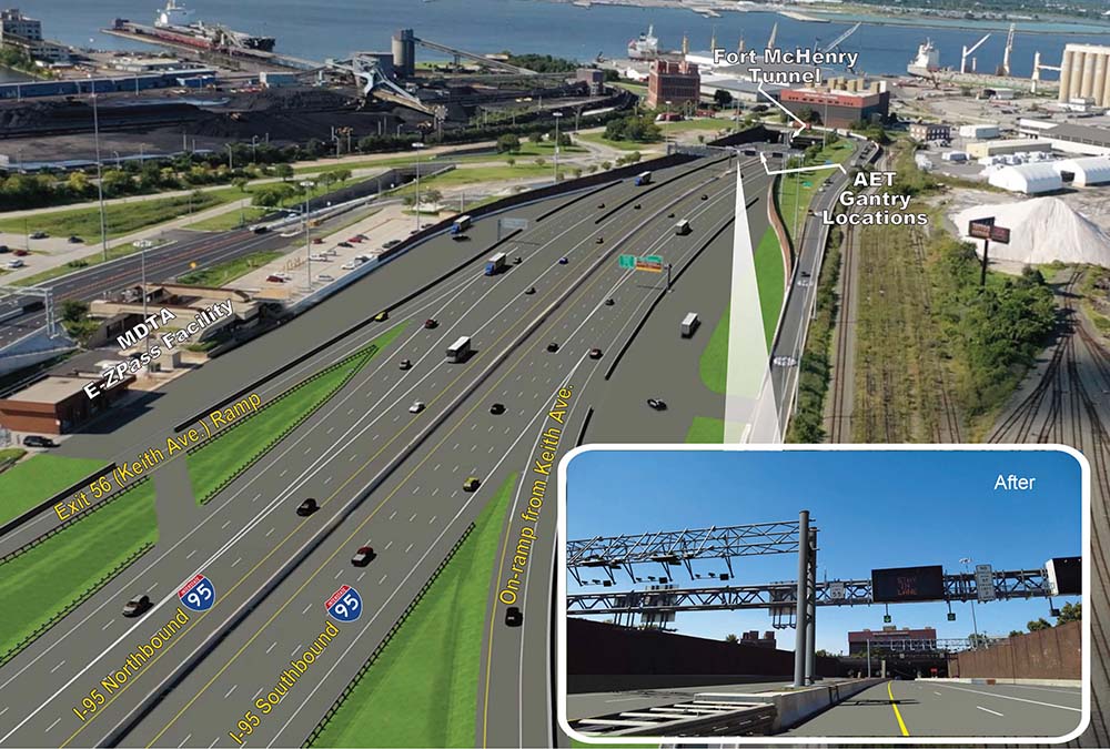 The Maryland Transportation Authority (MDTA) began all-electronic tolling (AET) construction work in Fall 2021 at the Fort McHenry Tunnel (I-95) toll plaza. The project will implement permanent highway-speed AET at the Fort McHenry Tunnel toll plaza. With cashless toll collection, there’s no slowing or stopping to pay tolls. Instead, motorists pay tolls at highway speed via E-ZPass, Pay-By-Plate or Video Tolling. Benefits include increased safety, less engine idling and better fuel efficiency.