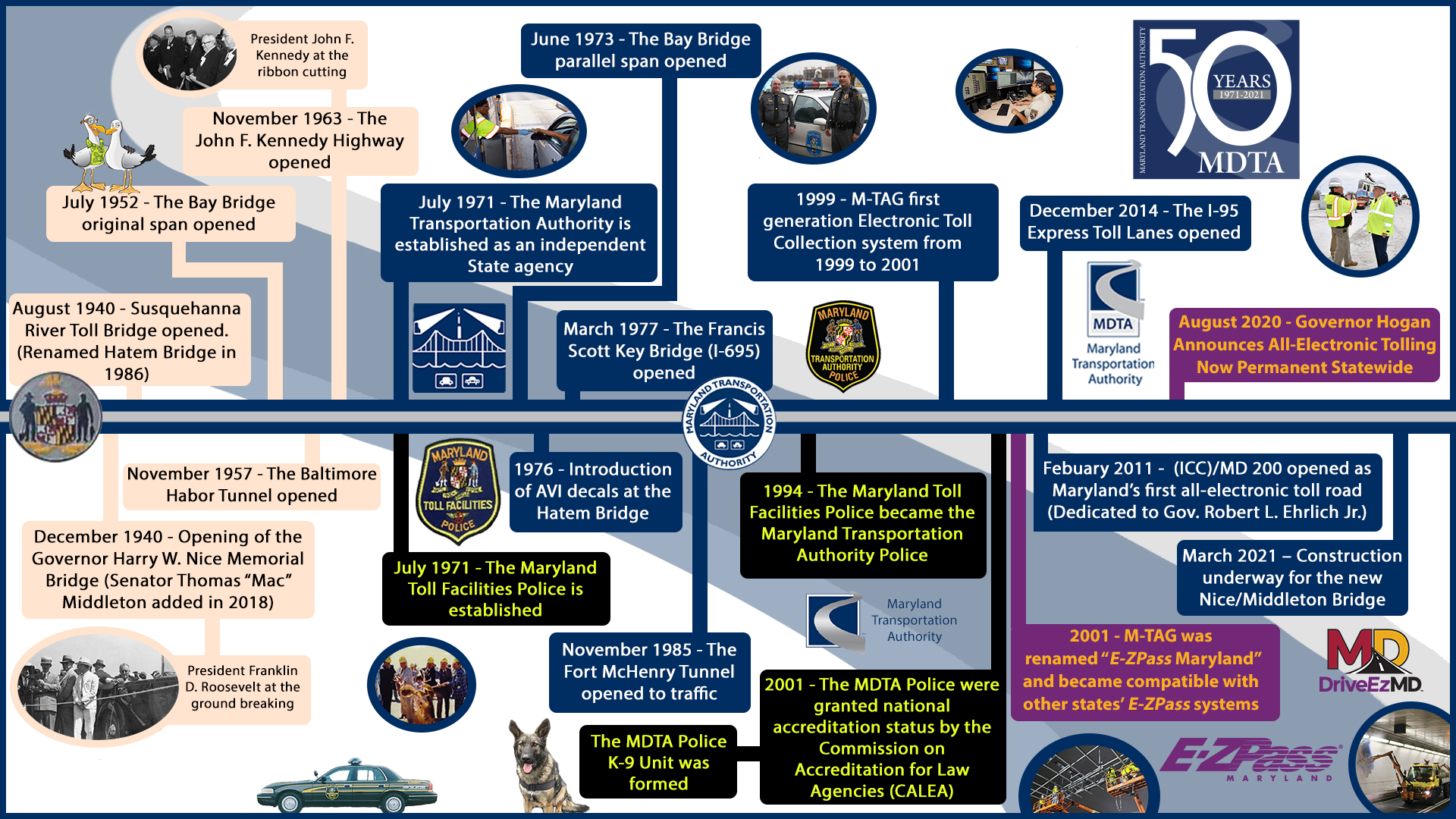 For 50 years, the MDTA has provided Maryland’s citizens and visitors with safe, secure, reliable and convenient transportation facilities. We are committed to preserving our vital infrastructure and to maintaining quality and excellence in our customer service. We rely on our organization’s values, traditions, and most importantly our employees, to achieve these goals. Celebrate with us and take a trip through our history!