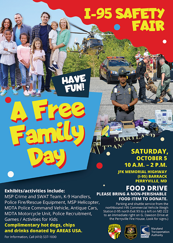MSP Crime and SWAT Team, K-9 Handlers, Police Fire/ Rescue Equipment, MSP Helicopter, MDTA Police Command Vehicle, Antique Cars, MDTA Motorcycle Unit, Police Recruitment, Games/ Activities for kids, Complimentary hot dogs, chips and drinks donated by AREAS USA.