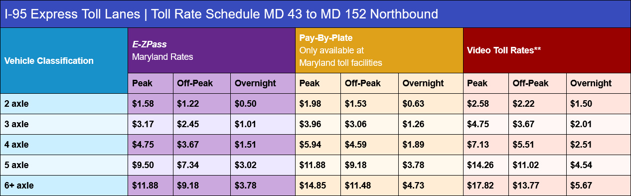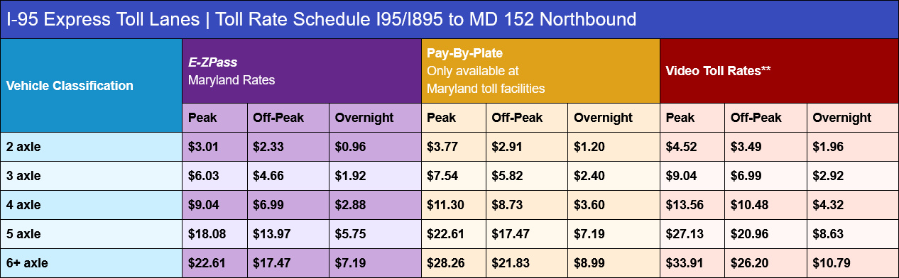 The I-95 ETL northbound extension project incorporates improved lighting, advanced stormwater management and safety features designed to meet the latest environmental standards. The MDTA worked closely with community stakeholders and environmental agencies to ensure that the extension aligns with Maryland’s sustainability goals, enhancing both infrastructure resilience and environmental stewardship. With the new northbound ETL open, MDTA anticipates that commuters along the I-95 corridor will experience more reliable travel times, particularly during peak rush hours. Variable toll rates will continue to apply, ensuring smooth traffic flow based on real-time traffic data and demand. The updated toll rates are shown below and can be found on the MDTA toll rates web page.