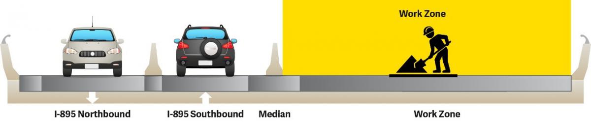 Note: The traffic pattern remains the same on southbound I-895 before the work zone. Southbound I-895 traffic approaching the work zone must use the left lane to remain on I-895 and the right lane is exit only lane for Exit 6 (I-97 and MD 2).